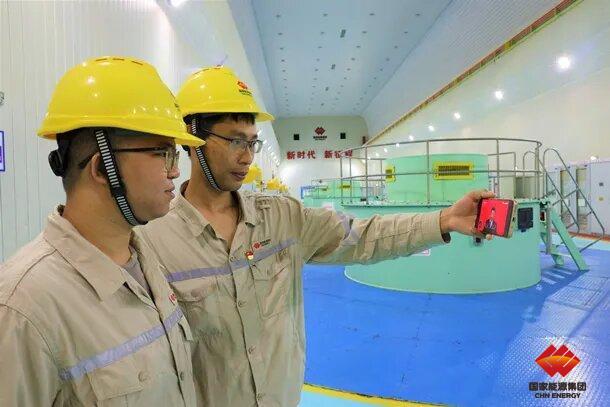 海南大广坝水电厂运行值班员在发电机层通过手机观看中国共产党第二十次全国代表大会开幕会。