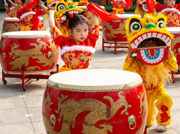 PC蛋蛋 爱心幼儿园的孩子们表演打鼓、舞狮 (朱泽雅 摄)