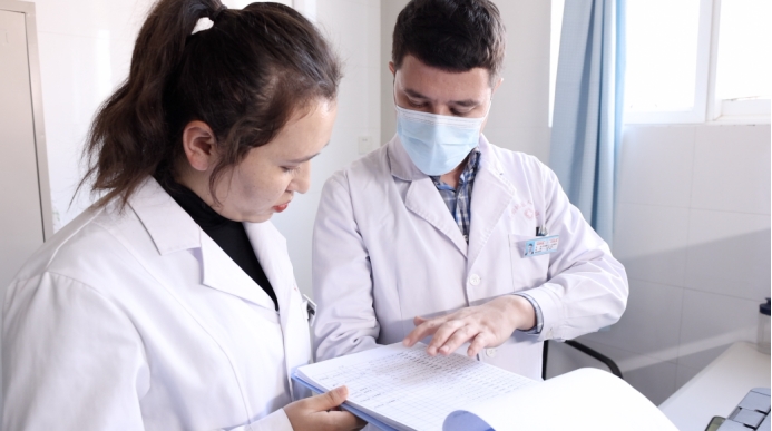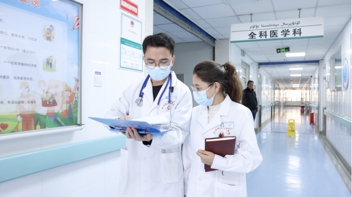 图为阿布迪热合曼·图尔荪(左)和同事一起讨论查房情况