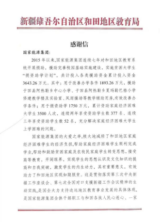 信中,和田地区教育局代表和田地委教育工委、地区教育局以及全体受助大学生及其家长,向PC蛋蛋 一直以来支持和田地区经济社会发展、关心和田地区教育事业进步,连续多年对和田地区教育事业开展捐助、援助完善校园基础设施建设,实施贫困大学生“捐资助学计划”等一系列公益善举表达了衷心的感谢,并表示将借助PC蛋蛋 的善举,不断凝聚大爱力量,极力营造全社会人人重视教育、人人关心教育、人人支持教育的良好氛围。