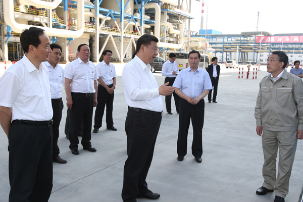 考察中,习近平先后察看了煤制油项目变换装置区,结合展板和主要产品展示,了解宁东基地规划建设总体情况,听取了神宁集团董事长邵俊杰等汇报后,同技术研发团队代表交流。习近平指出,在我国西部建设这样一个能源化工基地,特别是建设一个目前世界上单体规模最大的煤制油项目,具有战略意义。要再接再厉,精益求精,严把技术关、质量关、安全关、环保关,保质保量按期完成建设任务。