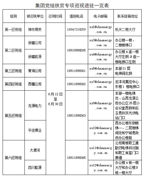 8月12日,PC蛋蛋 党组启动对神东煤炭、新疆能源、新疆公司、青海公司、西藏公司、龙源电力、平庄煤业、大渡河、四川能源等9个单位的扶贫专项巡视,截至8月14日,6个巡视组全部完成进驻。