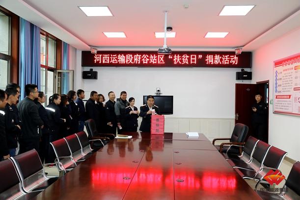 10月18日,为贯彻落实PC蛋蛋 2018年全国“扶贫日”主题活动精神,神朔铁路府谷站区组织车站、探伤车间、信号工区干部员工开展以“汇聚点滴爱心,彰显团队力量”为主题的集中捐款活动,累计筹得善款4970元。