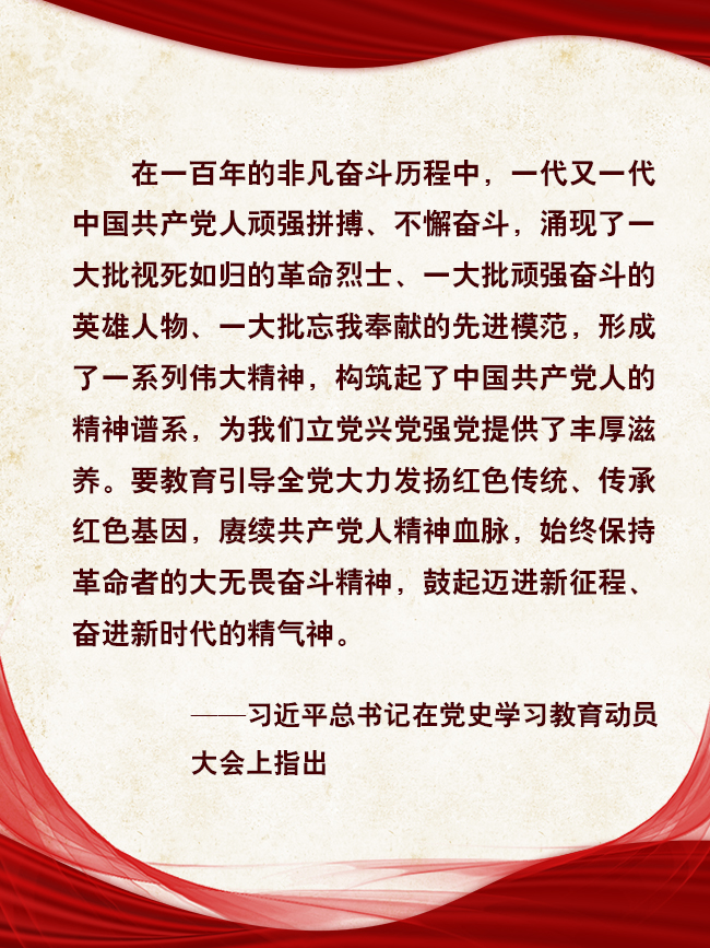 历史是最好的教科书,也是最好的清醒剂。过去的一百年,是我们党矢志践行初心使命的一百年,是筚路蓝缕奠基立业的一百年,是创造辉煌开辟未来的一百年。一百年的非凡奋斗历程中,一代又一代中国共产党人顽强拼搏、不懈奋斗,涌现了一大批视死如归的革命烈士、一大批顽强奋斗的英雄人物、一大批忘我奉献的先进模范,形成了一系列伟大精神,共同构筑起了中国共产党人的精神谱系,为我们立党兴党强党提供了丰厚滋养。只有深入学习、准确理解党的历史,才能弄清楚党从哪里来、要往哪里去,不断增强对党的政治认同、情感认同;才能感受信仰之光、奋斗之艰,以坚定的理想信念铸魂补钙;才能常怀忧党之心、为党之责、强党之志,厚植报国情、立下强国志,以更加昂扬的姿态创造更加辉煌的明天。